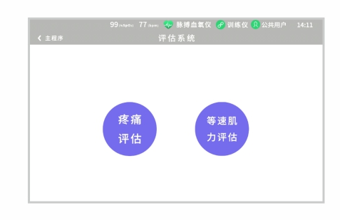 心肺監(jiān)護(hù)功能:采用藍(lán)牙連接的脈搏血氧儀,心肺監(jiān)護(hù)功能訓(xùn)練過程中持續(xù)檢測(cè)患者的心率、血氧濃度,當(dāng)患者心肺功能異常時(shí)可降低訓(xùn)練強(qiáng)度或停止訓(xùn)練。